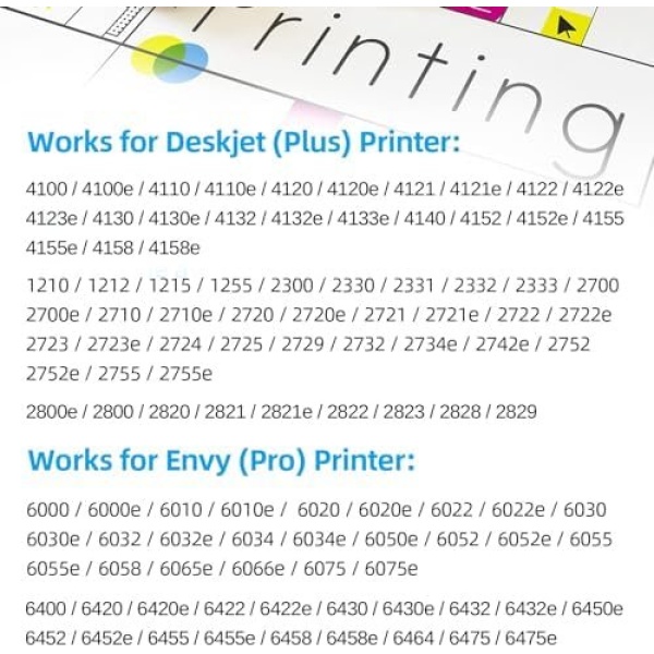 Compatible Printer: For DeskJet 2734e, 1255, 2710e, 2720e, 2721e, 2722, 2722e, 2723e, 2724, 2725, 2732, 2742e, 2752e, 2755, 2755e, 2800, 2800e, 4110e, 4120e, 4121e, 4122e, 4123e, 4130e, 4132e, 4133e, 4152e, 4155e, 4158e; For DeskJet Plus 4122, 4132, 4155 Printer (other models are shown in the image).